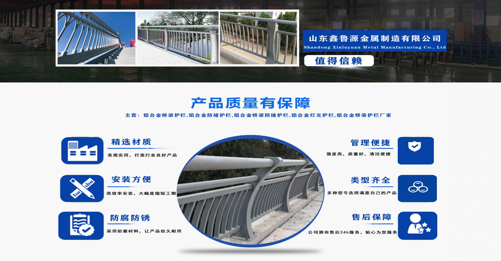 山東鑫魯源金屬制造有限公司主要經營:鋁合金橋梁護欄,鋁合金防撞護欄,鋁合金橋梁防撞護欄,鋁合金燈光護欄,不鋁合金橋梁護欄廠家,環波梁橋梁護欄,環波梁防撞護欄。質量可靠、經濟實用的顯著特點。公司為客戶提供可靠售后保障,堅持“以品質立足、服務求發展”,愿與各界朋友精誠合作、攜手發展! 服務優勢:真誠的服務理念、完善的服務體系。公司專業力量充足;工程案例眾多、從業經驗豐富;公司以可靠質量的產品,合理的價格,完善的售后服務,能夠滿足市場各個企業的需求?! ∑髽I精神:執著追求 持續創新執著追求,就是堅持不懈、堅定從容,專注于自己的事業,把能做的事情做好,不斷克服困難、把握機遇,贏得未來。 持續創新,就是生命不息、創新不止,通過持續實施技術創新、管理創新、市場創新,獲取持續的競爭優勢。...